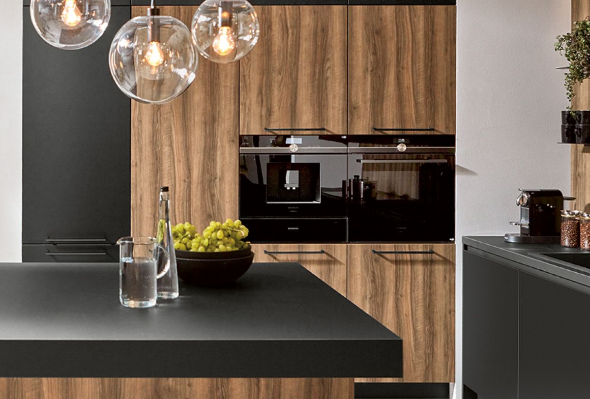 Diese Küche vereint alles, was eine stilvolle Küche benötigt! Die natürliche Schönheit der Holzmaserung kombiniert mit klassischen Griffen und dunklen Farbakzenten für ein ausdrucksstarkes Statement.