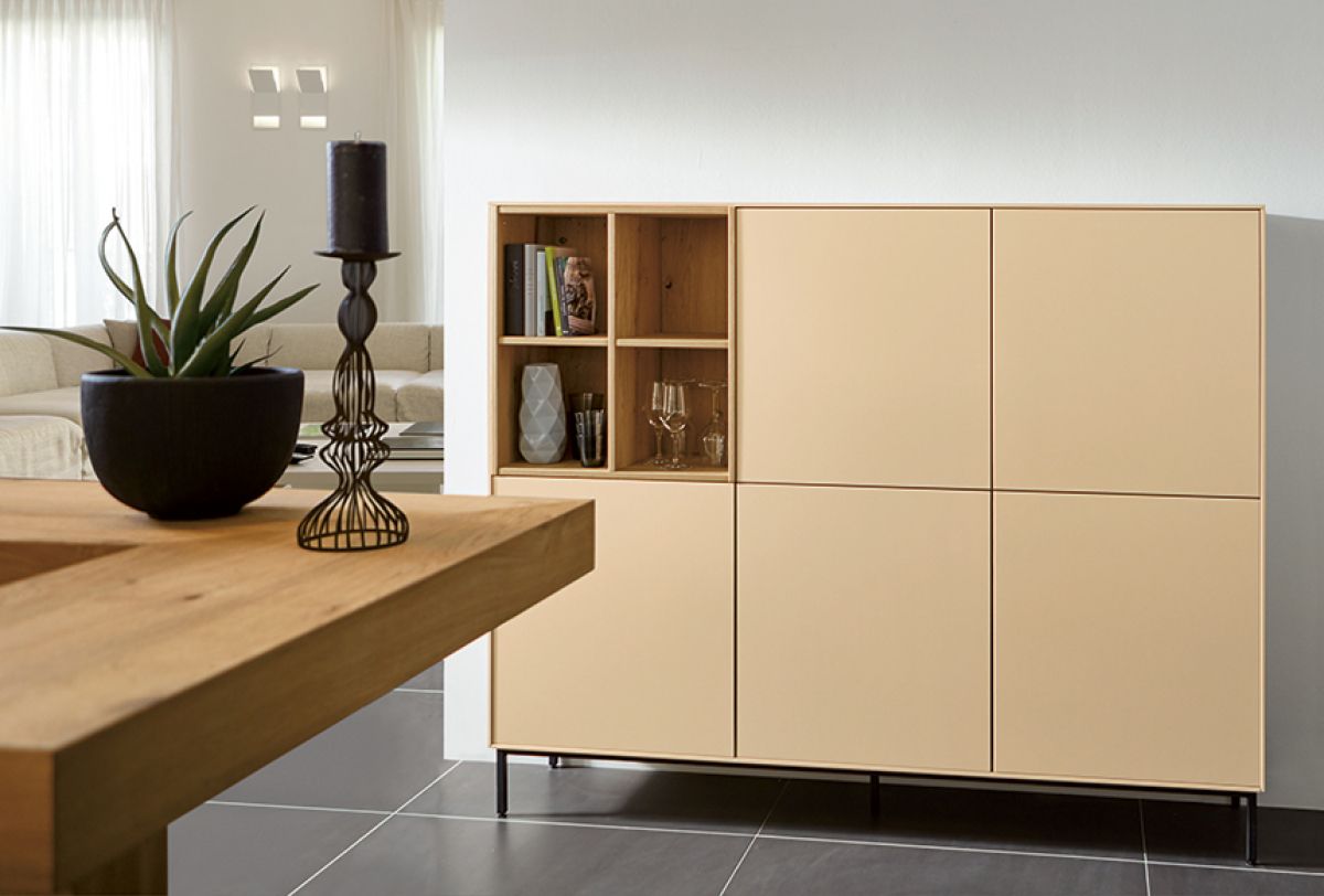 Das passende Sideboard ist die ideale Ergänzung zur Kochinsel und der integrierten Theke. Es bietet Ihnen zusätzlichen Stauraum und unterstreicht das wohnliche Interieur. Offene Regale lockern die Gestaltung dieser Küche auf und bieten Ihnen genügend Platz für Ihre Gewürze, Kochbücher oder persönlichen Wohnaccessoires, die in Ihrer Küche untergebracht werden sollen.