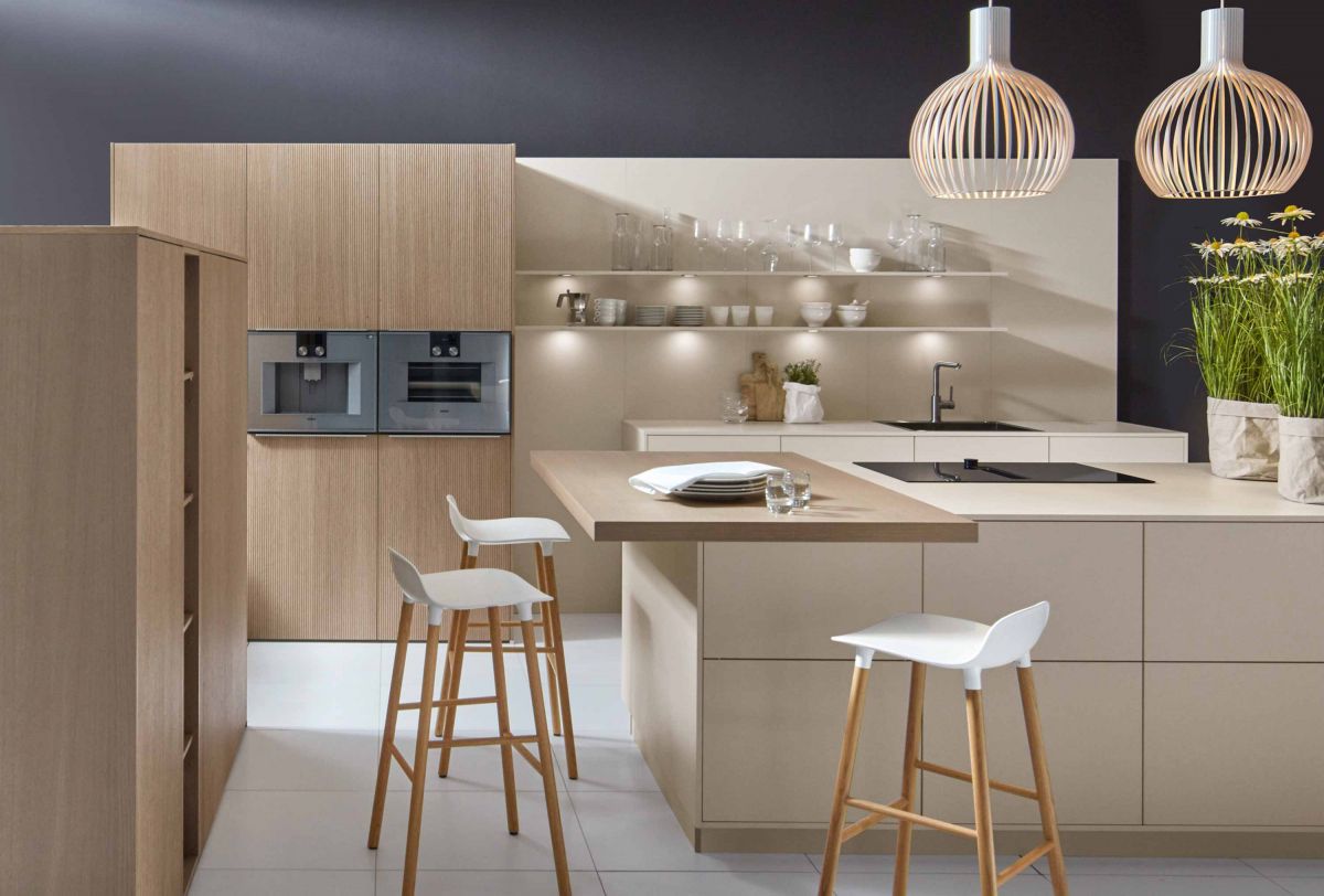 Diese zeitlose Küche überzeugt mit ihrer einheitlichen Farbwahl, die mit einer hellen Eiche-Optik ideal abgerundet wird. Die aufgeräumte, zurückhaltende Farbgestaltung lässt sich ideal mit Kontrasten, Mustern oder verschiedensten Materialien kombinieren.
