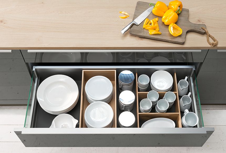 Besonders praktisch sind stabile Besteckkästen, die Ihnen ausreichend Platz für Ihr alltägliches Besteck ermöglichen. Aber auch flexibel positionierbare Einsätze für die Schubauszüge wie beispielsweise Trennstege oder Quer- und Längsteiler eignen sich hervorragend, um Ihr Geschirr, Töpfe oder haltbare Lebensmittel griffbereit zu halten.