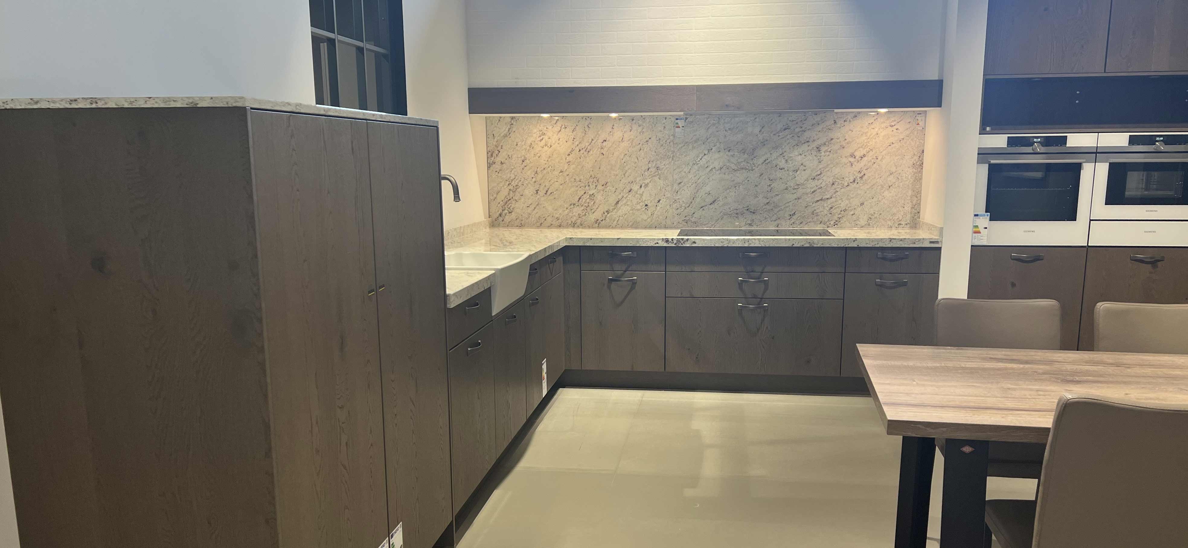 Diese Küche überzeugt mit der eleganten Optik. Die dunklen Fronten in Holzoptik harmonieren perfekt mit der hellen Natursteinarbeitsplatte Fantastic White.