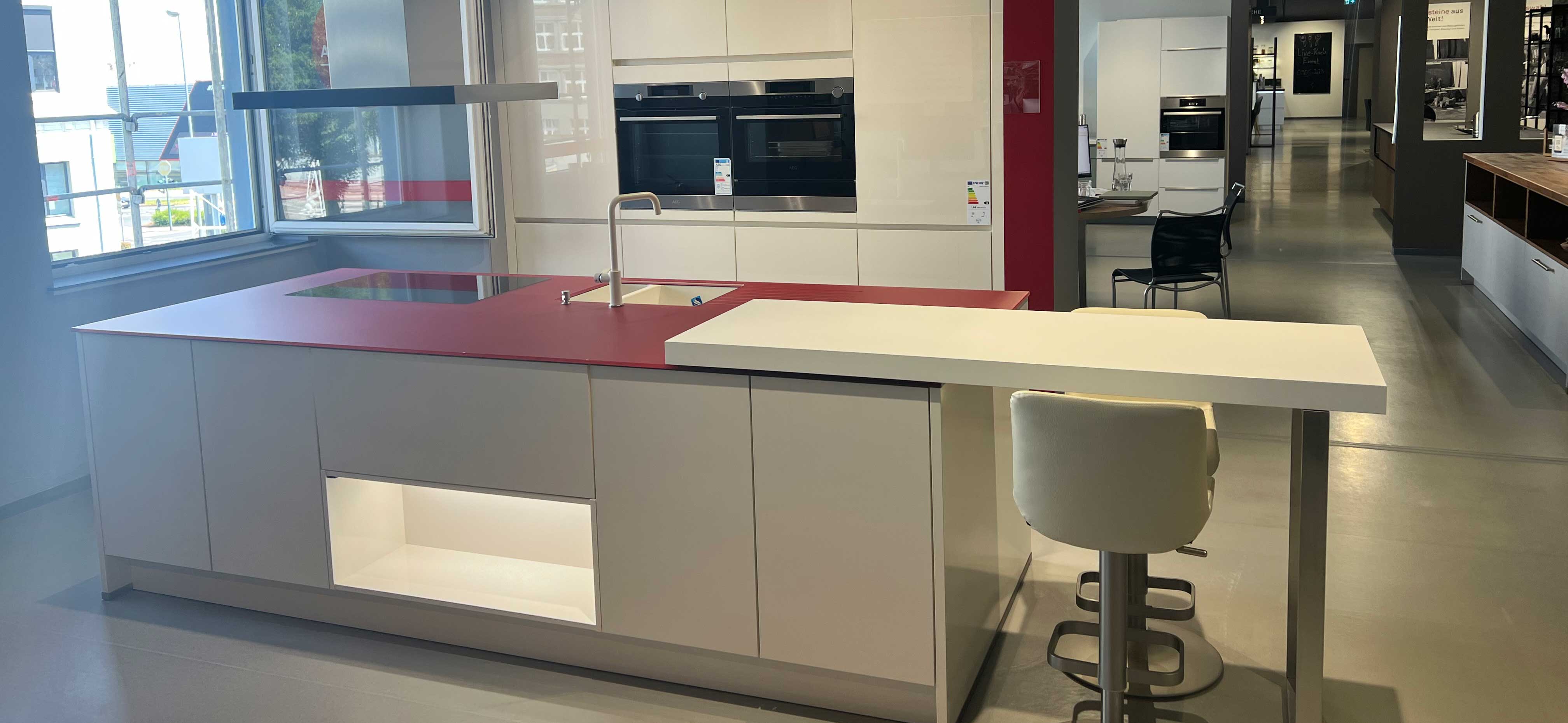 Das Highlight: Mit der roten Arbeitsplatte wird ein besonderer Farbakzent in der eher zurückhaltenden Küche gesetzt und bildet einen spannenden Kontrast zur restlichen Küche.