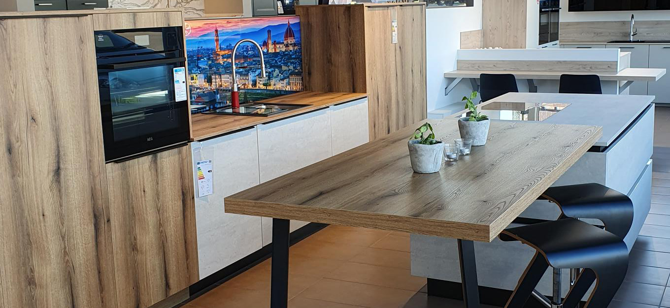 Diese Küche bringt alles mit, was Sie für den Alltag benötigen. Die Schränke und Schubauszüge in der Insel bieten ausreichend Stauraum für Ihr Geschirr sowie Ihre Kochtöpfe und Pfannen. Die Einbauküche aus unserem Abverkauf ist bereits mit passenden Elektrogeräten vom Hersteller AEG ausgestattet.