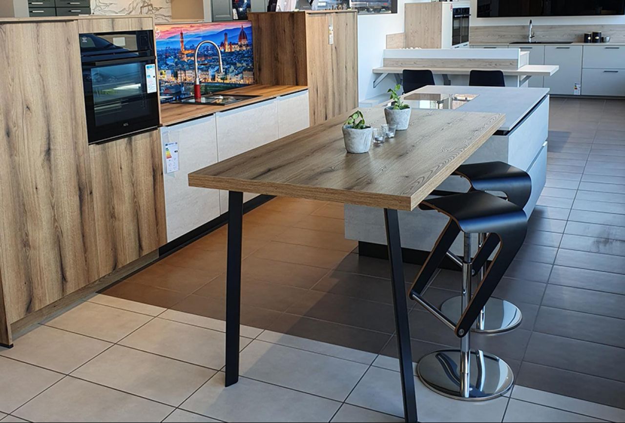 Der angrenzende Tisch und die Barhocker sind im Preis bereits inklusive.